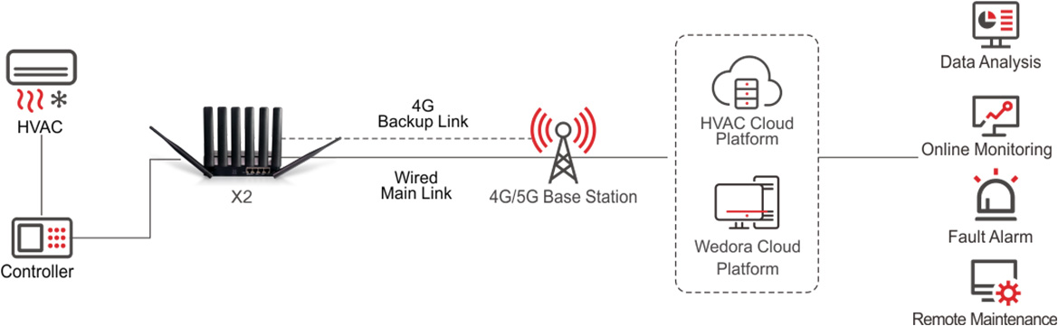 Hongdian provides X2 4G/5G intelligent gateway to connect the air conditioning controller to internet and collect various types of data. It can also use local buffer mechanism to intelligently upload data to reduce network overhead while ensuring data reliability real time performance; Combined with the alarm threshold set by the customer, equipment fault alarm and diagnosis is realized; The technicians in the service center of the air conditioner manufacturer can respond quickly after the fault occurs and diagnose the fault and provide timely and efficient equipment maintenance service to the customers of air conditioning manufacturers.
